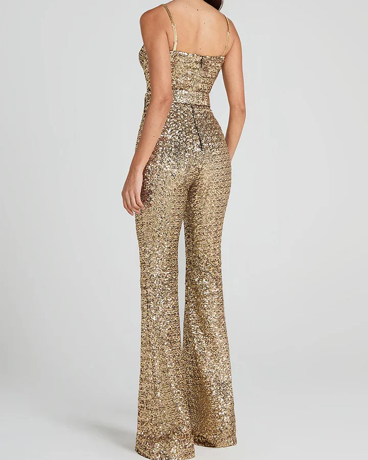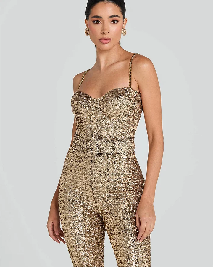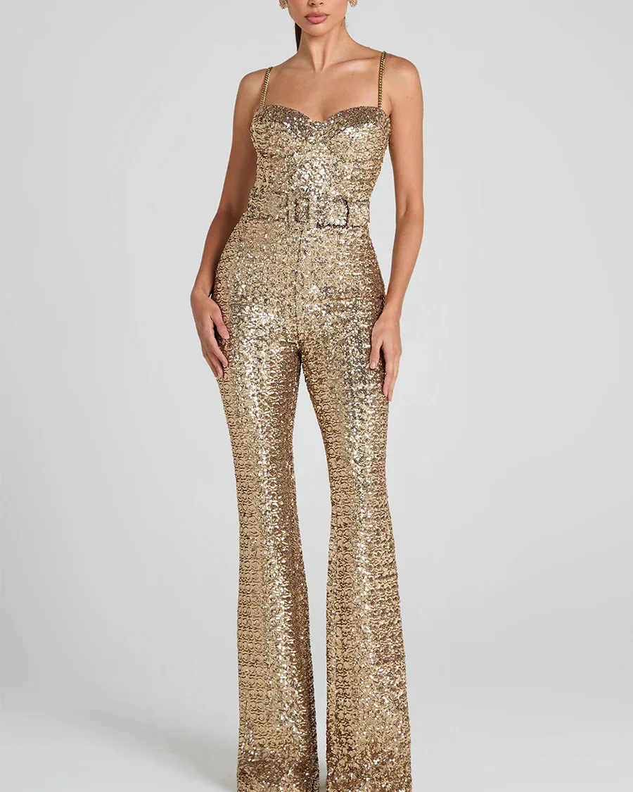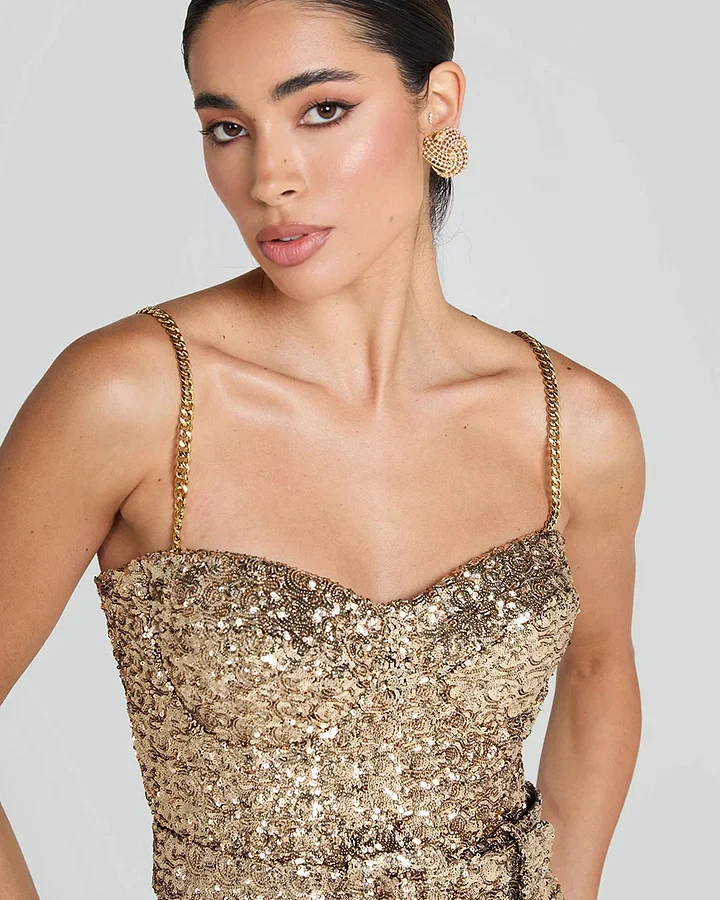 Los tirantes de cadena metálica añaden un detalle moderno y glamuroso, y el cinturón a juego define la cintura para un acabado elegante y favorecedor. Perfecto para eventos de noche, fiestas, bodas o celebraciones donde quieras destacar con estilo y seguridad. Una pieza impactante que combina glamour, elegancia y tendencia en un solo look.