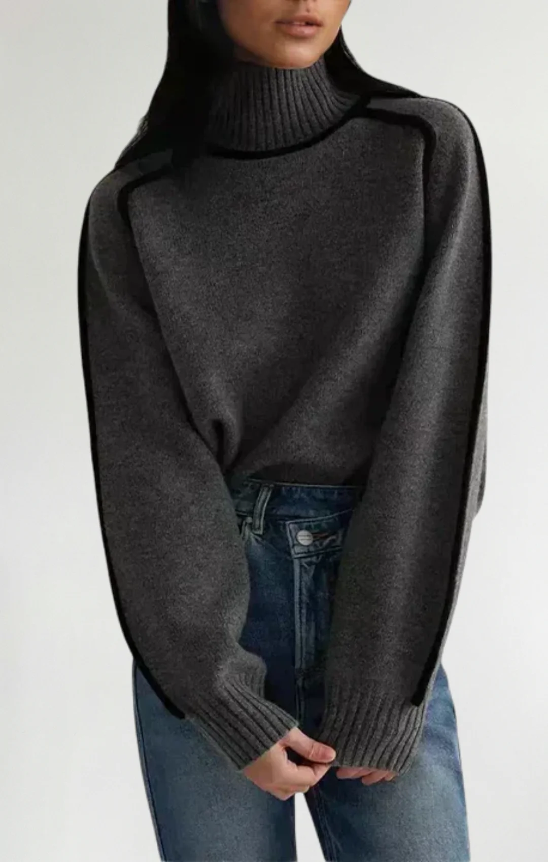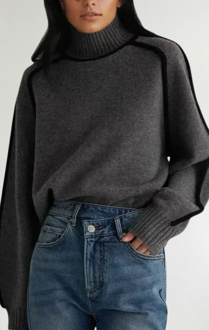 El diseño se realza con un delicado ribete en contraste que enmarca hombros y mangas, aportando carácter y un sutil aire moderno. El cuello alto de punto canalé añade estructura y equilibrio a la silueta, mientras que las mangas ligeramente amplias y los puños marcados refuerzan su estética refinada.